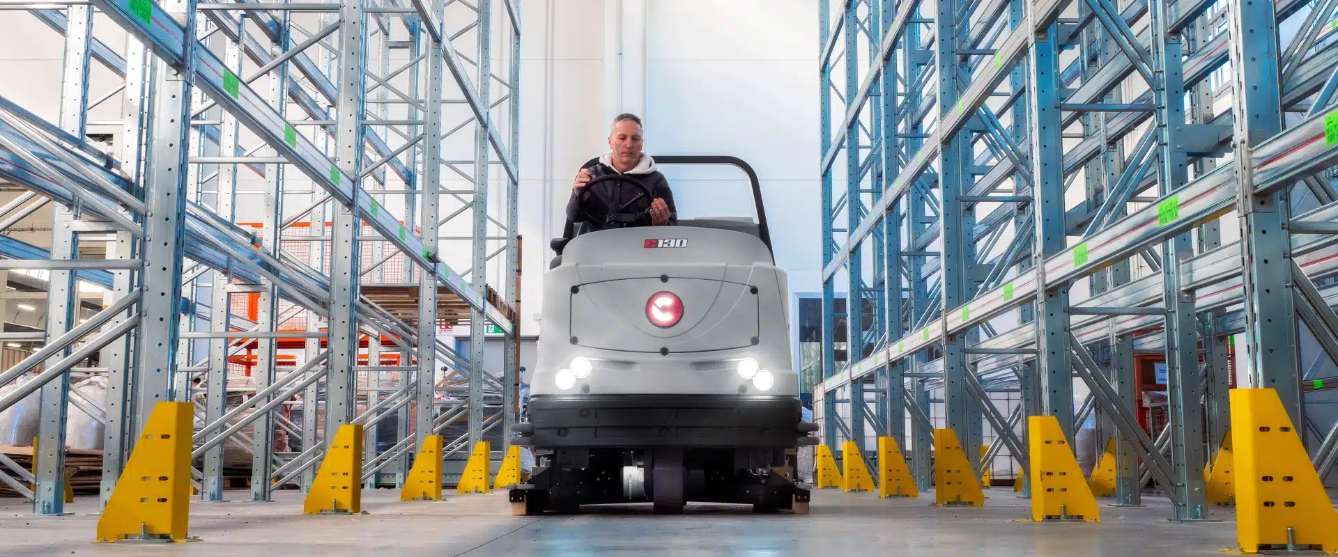 Comac C130 lavasciuga pavimenti è una macchina industriale ad alte prestazioni progettata per la pulizia intensa e continuativa di grandi superfici in ambito logistico, industriale e commerciale.