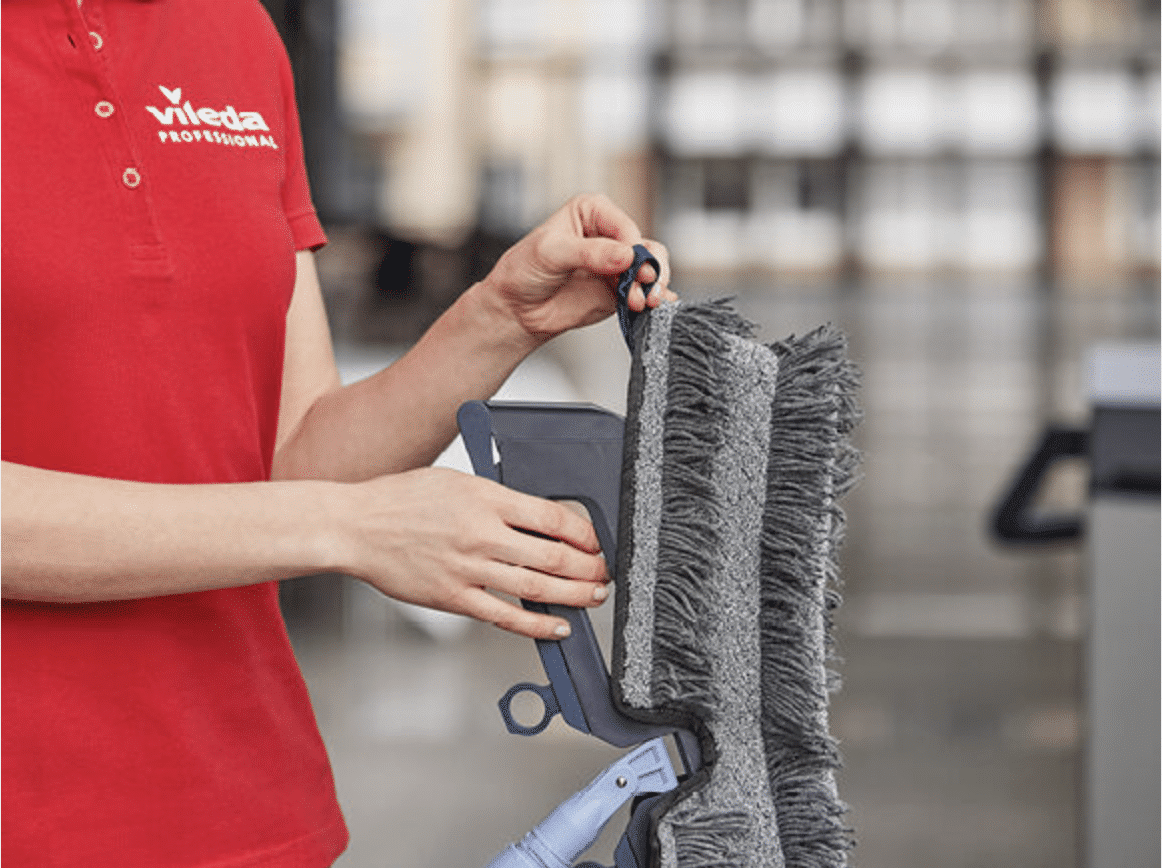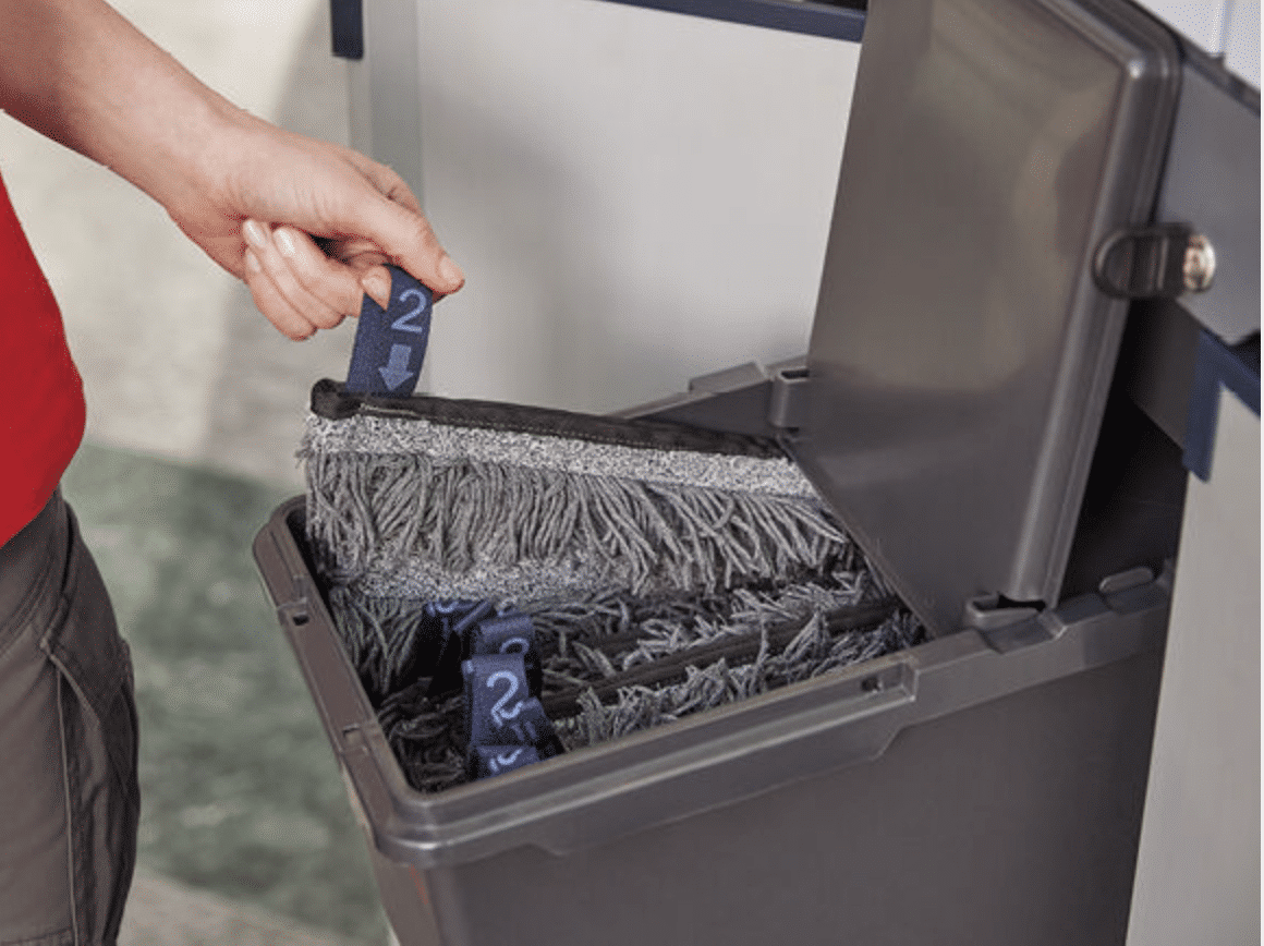 Il sistema incorpora mop e componenti con percentuali elevate di materiale riciclato, è certificato da enti ambientali e consente una riduzione dell’impatto ambientale e dei costi d’uso.