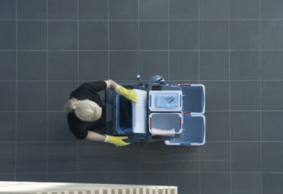 Il VoleoPro carrello professionale include elementi di fissaggio per sacchi da 70 litri, ganci supporto manici, ganci per segnali di avviso e un sistema integrato di stoccaggio utensili. Grazie a questo, gli operatori possono raggruppare materiali puliti e usati in modo ordinato, limitando errori di logistica e migliorando il flusso di lavoro. Il coperchio rifiuti integrato a scomparsa offre inoltre una soluzione discreta per depositare materiali usati o scarti.
