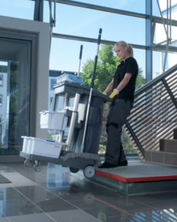 Il VoleoPro carrello professionale è una soluzione compatta e flessibile per la pulizia professionale: occupa solo 0,5 m², telaio a V in alluminio + plastica, ruote grandi per facile manovra. Perfetto per ambienti dove lo spazio è limitato.